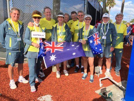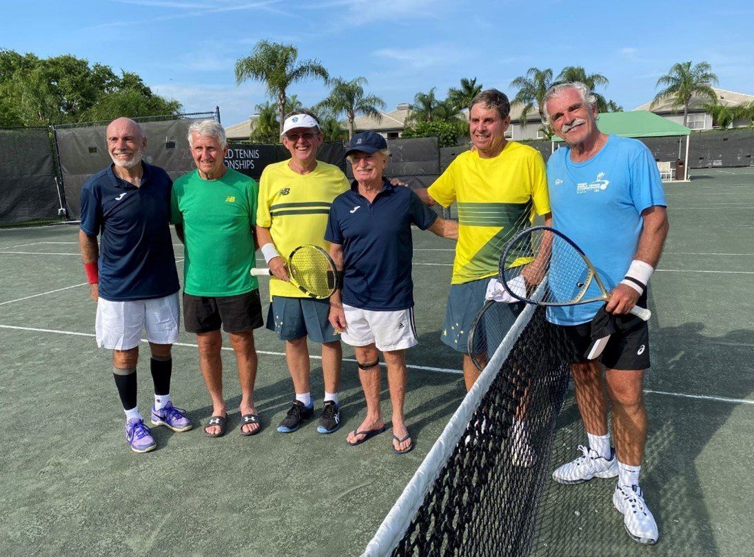 This edition would like to provide a short player’s perspective into the World Teams event in Boca Raton, USA. Our Australian teams were picked on player rankings at the end of Oceania 2020 which was the last tournament that all Australians could get to. Due to the new Omicron corona variant and other issues, some teams were somewhat disabled with a lack of team members and gifts to provide to opponents. The Australian team was warmly welcomed by the Americans including many holiday makers and depending on arrival dates were afforded the opportunity to practice on the American green clay courts. The Australian Super Seniors only had three teams and 10 members compared to other countries with a plethora of players. The opening ceremony was held outdoors at the largest venue, Boynton Beach, a public tennis facility. It was quite windy however was wonderful meeting all our opponents. The Australian men’s 70’s were ranked 3rd however ran in 10th position, their most memorable opponents being the Uruguayan team who spoke little English however were happy to share an after match drink except on two days when a torrential downpour sent everyone seeking shelter.